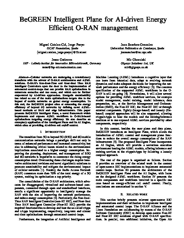 BeGREEN Intelligent Plane for AI-driven Energy Efficient O-RAN management